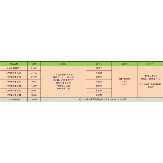層板尺寸 111*48 cm,採用厚度 3.6 cm 白樺木夾板製作,白樺木、胡桃木二種外觀。