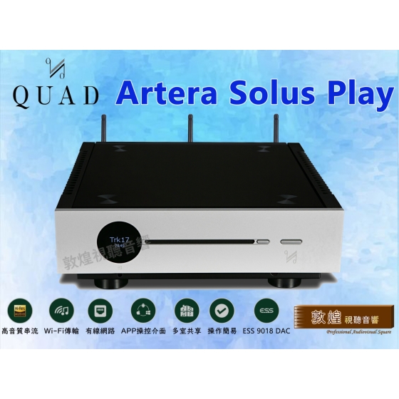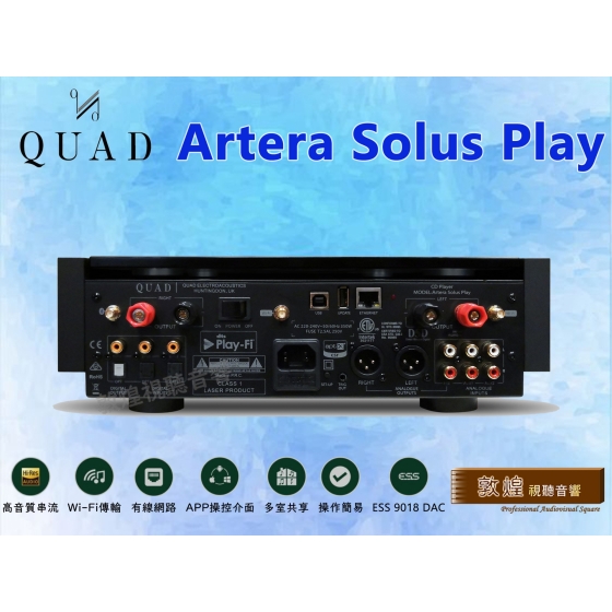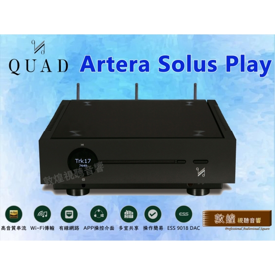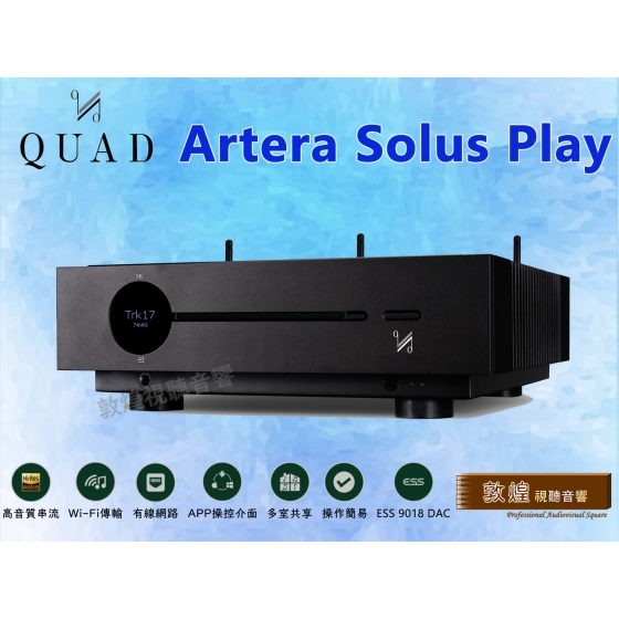『Artera』系統是 QUAD 尖端的 HI-END 線路產品,過往的產品訴求,除了優美的音質與細 膩的外觀工藝設計外,更特別著重機能的完善度。 QUAD 先前推出的 『Artera Solus』,內 建 CD 播放/ USB DAC /與前級輸出(支援 XLR 平衡)的一體式綜擴,堪稱完美的機種。如 今,再次進化為『Artera Solus Play』,加入目前最流行的網路串流系統『DTS Play-Fi』,將 潮流及傳統完美的結合為一。 『Artera Solus Play』以 DTS Play-Fi 作為系統操控 APP,可支援 Spotify、KKBOX、TIDAL、 Qobuz、Deezer、Amazon Music、QQ MUSIC、iHeartRadio… 等音樂平台以及以 DLNA 串流方式播放 NAS 及電腦音樂檔,還有免費的網路電台,更可以方便地組成多組播放器或 者喇叭的多房間系統。 因操控界面採 DTS Play-FI APP,手機、平板及電腦下載後,就是串 流功能的顯示屏幕及遙控器。 『Artera Solus Play』仍提供系統遙控器,方便使用者直接開 關機、訊源切換、音量控制及所有 CD 播放操作。 『Atera Solus Play』外型工藝由 QUAD 70~90 年代知名的 Rodney Mead 先生再度領軍設 計,將 QUAD 簡約美學的精神發揮於現今更加現代化的外觀,精緻的鑄鋁細磨砂前面板, 結合兩側精鋼鋁製散熱片,加上 QUAD LOGO 的玻璃上蓋(分離式),呈現 HI-END 精品 級質感。
