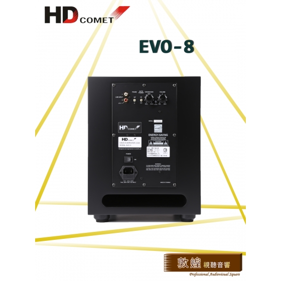 EVO-8的外觀設計維持HD Comet一貫的的風格,筆直的箱體線條僅在前面板上下兩端修飾出斜面。箱體表面採用低調的消光烤漆,優點是不易沾染指紋,目前有黑、白兩種顏色可以選擇。單體尺寸從型號就可以看得出來,搭載了1只8吋低音單體,搭配使用的D類擴大機模組擁有150瓦輸出功率,而且通過能源之星(Energy Star)標準。