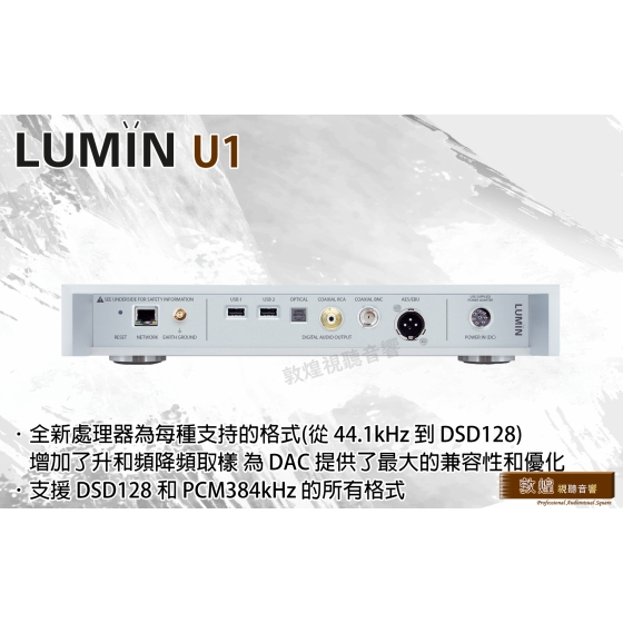 U1的數位輸出非常豐富,有兩組USB,可連接USB DAC,也可兼做數位輸入,連外接硬碟。此外它更有光纖、同軸、BNC、AES/EBU等S/PDIF數位介面各一組。如果要輸出最高規格的檔案,要優先選擇USB輸出,這樣DSD可支援到DSD512、PCM則到32bit/768KHz。如果使用其他S/PDIF輸出,則受限於規格,DSD方面僅能以DoP方式輸出DSD64的檔案,而PCM則可支援到24bit/192KHz。至於檔案型式,除了常見的各種類型都可接受外,更重要的是它支援MQA,這樣您就可以透過網路串流,聽到線上服務商提供的高解析檔案。