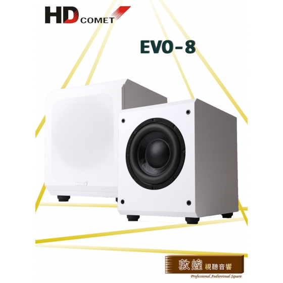 EVO-8的外觀設計維持HD Comet一貫的的風格,筆直的箱體線條僅在前面板上下兩端修飾出斜面。箱體表面採用低調的消光烤漆,優點是不易沾染指紋,目前有黑、白兩種顏色可以選擇。單體尺寸從型號就可以看得出來,搭載了1只8吋低音單體,搭配使用的D類擴大機模組擁有150瓦輸出功率,而且通過能源之星(Energy Star)標準。