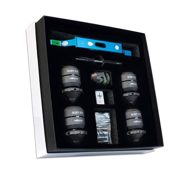 整套 Sort Fut Premium Package 包含四個 Sort Fut 腳釘,加上 8 mm、6 mm 與 1/4 英吋三種轉接頭,以及專用的調整工具,方便搭配各種音響器材安裝,原廠還附上雷射水平校正器,讓您可以精確地安裝 Sort Fut。