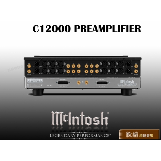 C12000是美國High End大廠McIntosh最新發表的旗艦前級,其採用成本相對高昂的兩件式及全平衡線設計,主要線路與電源部份完全獨立隔離,以追求最純淨的聲音再生可能。C12000旗艦前級分為控制模組(Controller Module)與前級模組(Preamplifier Module)兩個部份,控制模組內包括了電源控制、資料接口及與對外的控制連結,模組內有兩個完全獨立的電源分別供左右聲道使用,還設有兩個微處理器為控制系統提供了強而有力的運作核心。