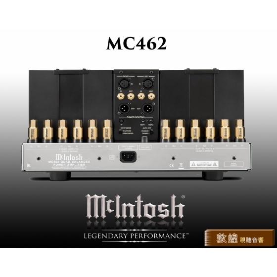【產品介紹】 動態大增66% McIntosh MC462後級擴大機 動態表現一舉提升66%,讓最新發表的MC462成為McIntosh新一代功率最大的立體聲後級擴大機。 MC462的輸出功率如同先前的MC452,仍維持在450瓦,得力於McIntosh獨家的Autoformer技術,使MC462不論面對8歐姆、4歐姆還是2歐姆喇叭,都能持續輸出450瓦功率。不同的是,MC462的濾波電容量比MC452增加50%,使動態餘量(dynamic headroom)從1.8dB提高至3.0dB,意即動態表現提升了66%,控制力更充足。 MC462在其他方面也做了提升。例如標誌性的藍色錶頭改用直接LED背光,不僅色彩更漂亮,而且顏色更精準。此外,電源變壓器與2顆Autoformer變壓器的金屬上蓋嵌入玻璃,上頭還費心地繪製變壓器繞線數值,外型更為美觀。擴大機上方的整個後半部為4塊大型散熱器,直接連接在功率晶體上,可幫助熱量立即散逸。 MC462備有XLR與RCA輸入,並貼心地一口氣提供3組喇叭輸出端子,不論你是要單線接駁、雙線接駁甚至三線都沒問題。此外,MC462也提供XLR與RCA直通輸出,即便你的前級僅有一組前級輸出,也可透過MC462連接至其他擴大機。 【產品規格】