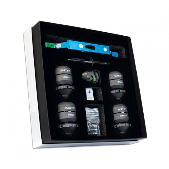整套 Sort Fut Premium Package 包含四個 Sort Fut 腳釘,加上 8 mm、6 mm 與 1/4 英吋三種轉接頭,以及專用的調整工具,方便搭配各種音響器材安裝,原廠還附上雷射水平校正器,讓您可以精確地安裝 Sort Fut。